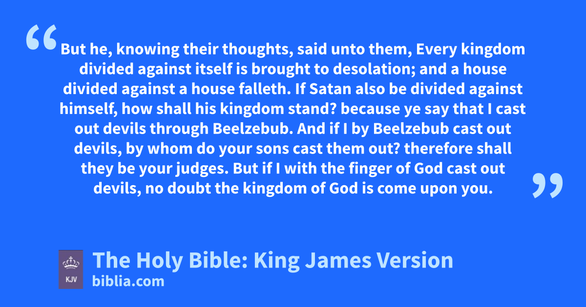 14 And he was casting out a devil, and it was dumb. And it came to pass, when the devil was gone out, the dumb spake; and the people wondered. 15 But some of them said, He casteth out devils through Beelzebubd the chief of the devils. 16 And others, tempting him, sought of him a sign from heaven. 17 But he, knowing their thoughts, said unto them, Every kingdom divided against itself is brought to desolation; and a house divided against a house falleth. 18 If Satan also be divided against himself, how shall his kingdom stand? because ye say that I cast out devils through Beelzebub. 19 And if I by Beelzebub cast out devils, by whom do your sons cast them out? therefore shall they be your judges. 20 But if I with the finger of God cast out devils, no doubt the kingdom of God is come upon you. 21 When a strong man armed keepeth his palace, his goods are in peace: 22 But when a stronger than he shall come upon him, and overcome him, he taketh from him all his armour wherein he trusted, and divideth his spoils. 23 He that is not with me is against me: and he that gathereth not with me scattereth. 24 When the unclean spirit is gone out of a man, he walketh through dry places, seeking rest; and finding none, he saith, I will return unto my house whence I came out. 25 And when he cometh, he findeth it swept and garnished. 26 Then goeth he, and taketh to him seven other spirits more wicked than himself; and they enter in, and dwell there: and the last state of that man is worse than the first.