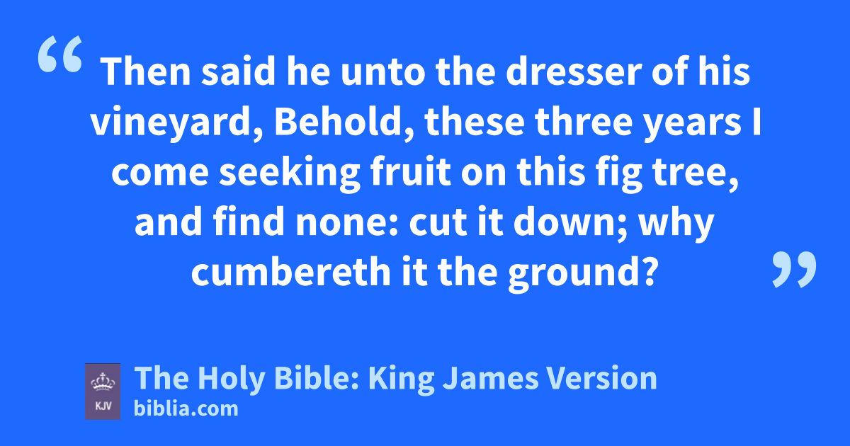 6 He spake also this parable; A certain man had a fig tree planted in his vineyard; and he came and sought fruit thereon, and found none. 7 Then said he unto the dresser of his vineyard, Behold, these three years I come seeking fruit on this fig tree, and find none: cut it down; why cumbereth it the ground? 8 And he answering said unto him, Lord, let it alone this year also, till I shall dig about it, and dung it: 9 And if it bear fruit, well: and if not, then after that thou shalt cut it down.