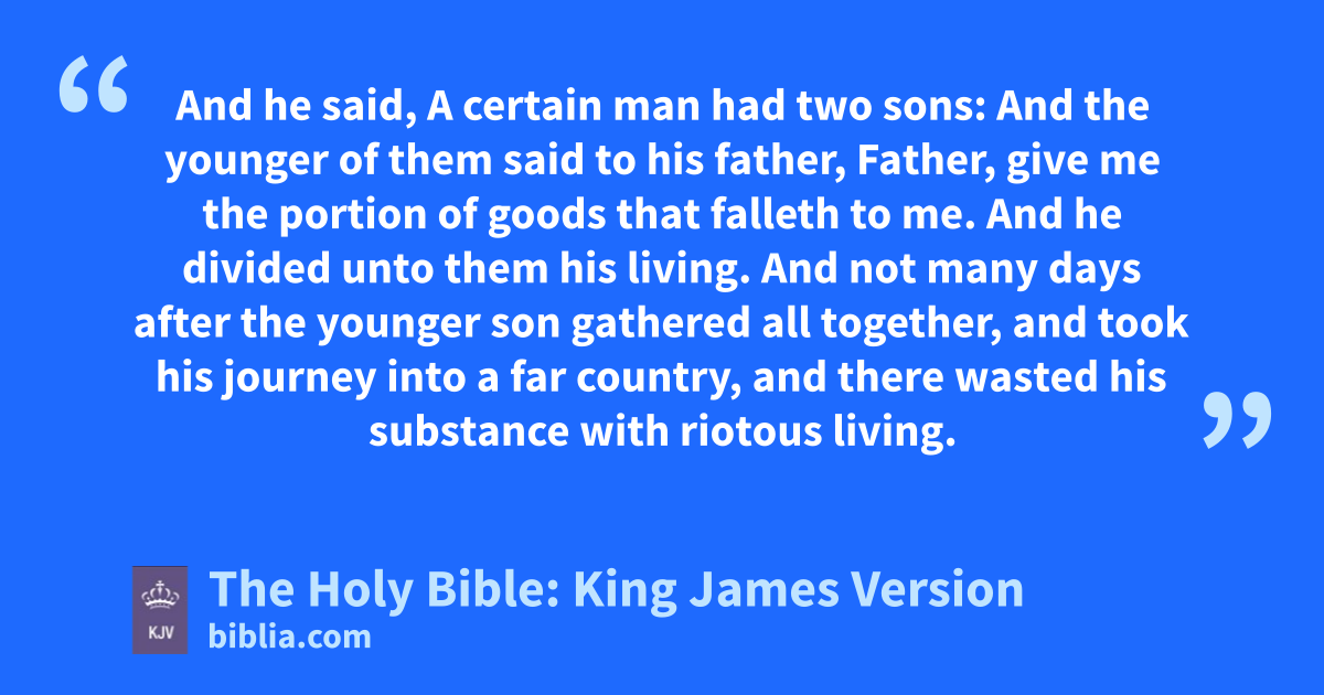 11 And he said, A certain man had two sons: 12 And the younger of them said to his father, Father, give me the portion of goods that falleth to me. And he divided unto them his living. 13 And not many days after the younger son gathered all together, and took his journey into a far country, and there wasted his substance with riotous living. 14 And when he had spent all, there arose a mighty famine in that land; and he began to be in want. 15 And he went and joined himself to a citizen of that country; and he sent him into his fields to feed swine. 16 And he would fain have filled his belly with the husks that the swine did eat: and no man gave unto him. 17 And when he came to himself, he said, How many hired servants of my father’s have bread enough and to spare, and I perish with hunger! 18 I will arise and go to my father, and will say unto him, Father, I have sinned against heaven, and before thee, 19 And am no more worthy to be called thy son: make me as one of thy hired servants. 20 And he arose, and came to his father. But when he was yet a great way off, his father saw him, and had compassion, and ran, and fell on his neck, and kissed him. 21 And the son said unto him, Father, I have sinned against heaven, and in thy sight, and am no more worthy to be called thy son. 22 But the father said to his servants, Bring forth the best robe, and put it on him; and put a ring on his hand, and shoes on his feet: 23 And bring hither the fatted calf, and kill it; and let us eat, and be merry: 24 For this my son was dead, and is alive again; he was lost, and is found. And they began to be merry. 25 Now his elder son was in the field: and as he came and drew nigh to the house, he heard musick and dancing. 26 And he called one of the servants, and asked what these things meant. 27 And he said unto him, Thy brother is come; and thy father hath killed the fatted calf, because he hath received him safe and sound. 28 And he was angry, and would not go in: therefore came his father out, and intreated him. 29 And he answering said to his father, Lo, these many years do I serve thee, neither transgressed I at any time thy commandment: and yet thou never gavest me a kid, that I might make merry with my friends: 30 But as soon as this thy son was come, which hath devoured thy living with harlots, thou hast killed for him the fatted calf. 31 And he said unto him, Son, thou art ever with me, and all that I have is thine. 32 It was meet that we should make merry, and be glad: for this thy brother was dead, and is alive again; and was lost, and is found.