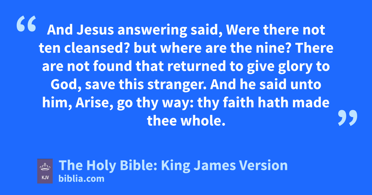 11 And it came to pass, as he went to Jerusalem, that he passed through the midst of Samaria and Galilee. 12 And as he entered into a certain village, there met him ten men that were lepers, which stood afar off: 13 And they lifted up their voices, and said, Jesus, Master, have mercy on us. 14 And when he saw them, he said unto them, Go shew yourselves unto the priests. And it came to pass, that, as they went, they were cleansed. 15 And one of them, when he saw that he was healed, turned back, and with a loud voice glorified God, 16 And fell down on his face at his feet, giving him thanks: and he was a Samaritan. 17 And Jesus answering said, Were there not ten cleansed? but where are the nine? 18 There are not found that returned to give glory to God, save this stranger. 19 And he said unto him, Arise, go thy way: thy faith hath made thee whole.