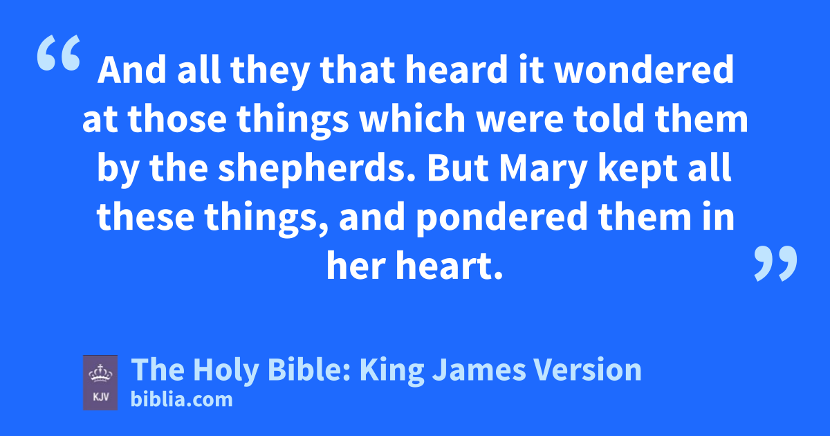 8 And there were in the same country shepherds abiding in the field, keeping watchd over their flock by night. 9 And, lo, the angel of the Lord came upon them, and the glory of the Lord shone round about them: and they were sore afraid. 10 And the angel said unto them, Fear not: for, behold, I bring you good tidings of great joy, which shall be to all people. 11 For unto you is born this day in the city of David a Saviour, which is Christ the Lord. 12 And this shall be a sign unto you; Ye shall find the babe wrapped in swaddling clothes, lying in a manger. 13 And suddenly there was with the angel a multitude of the heavenly host praising God, and saying, 14 Glory to God in the highest, and on earth peace, good will toward men. 15 And it came to pass, as the angels were gone away from them into heaven, the shepherdse said one to another, Let us now go even unto Bethlehem, and see this thing which is come to pass, which the Lord hath made known unto us. 16 And they came with haste, and found Mary, and Joseph, and the babe lying in a manger. 17 And when they had seen it, they made known abroad the saying which was told them concerning this child. 18 And all they that heard it wondered at those things which were told them by the shepherds. 19 But Mary kept all these things, and pondered them in her heart. 20 And the shepherds returned, glorifying and praising God for all the things that they had heard and seen, as it was told unto them.