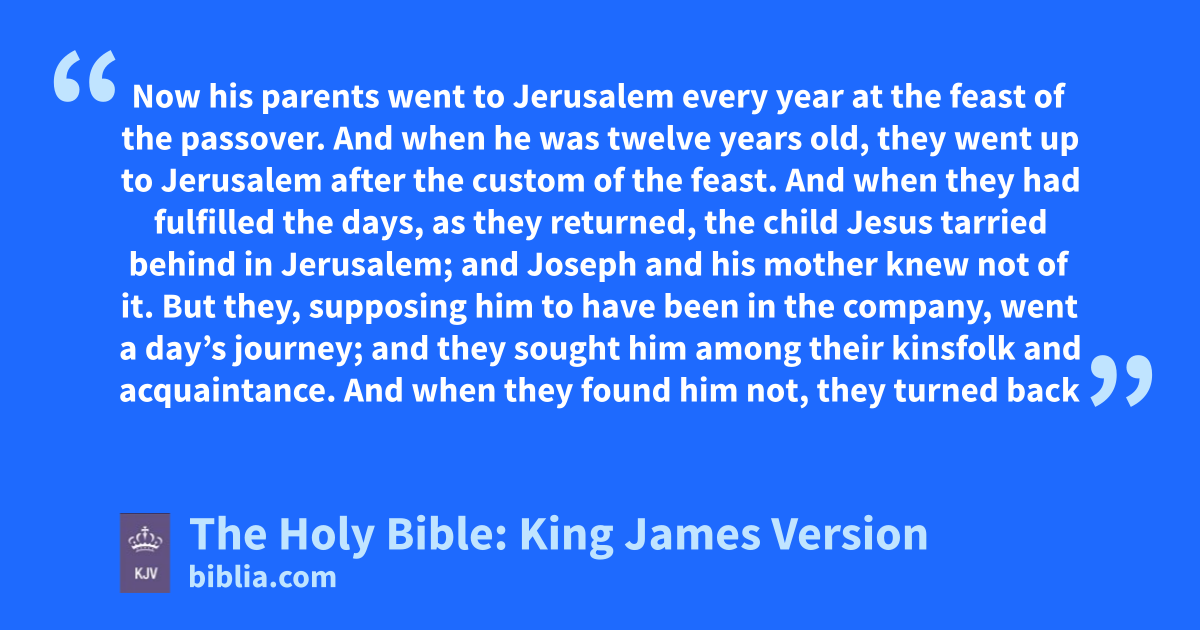 41 Now his parents went to Jerusalem every year at the feast of the passover. 42 And when he was twelve years old, they went up to Jerusalem after the custom of the feast. 43 And when they had fulfilled the days, as they returned, the child Jesus tarried behind in Jerusalem; and Joseph and his mother knew not of it. 44 But they, supposing him to have been in the company, went a day’s journey; and they sought him among their kinsfolk and acquaintance. 45 And when they found him not, they turned back again to Jerusalem, seeking him. 46 And it came to pass, that after three days they found him in the temple, sitting in the midst of the doctors, both hearing them, and asking them questions. 47 And all that heard him were astonished at his understanding and answers. 48 And when they saw him, they were amazed: and his mother said unto him, Son, why hast thou thus dealt with us? behold, thy father and I have sought thee sorrowing. 49 And he said unto them, How is it that ye sought me? wist ye not that I must be about my Father’s business? 50 And they understood not the saying which he spake unto them. 51 And he went down with them, and came to Nazareth, and was subject unto them: but his mother kept all these sayings in her heart. 52 And Jesus increased in wisdom and statureg, and in favour with God and man.