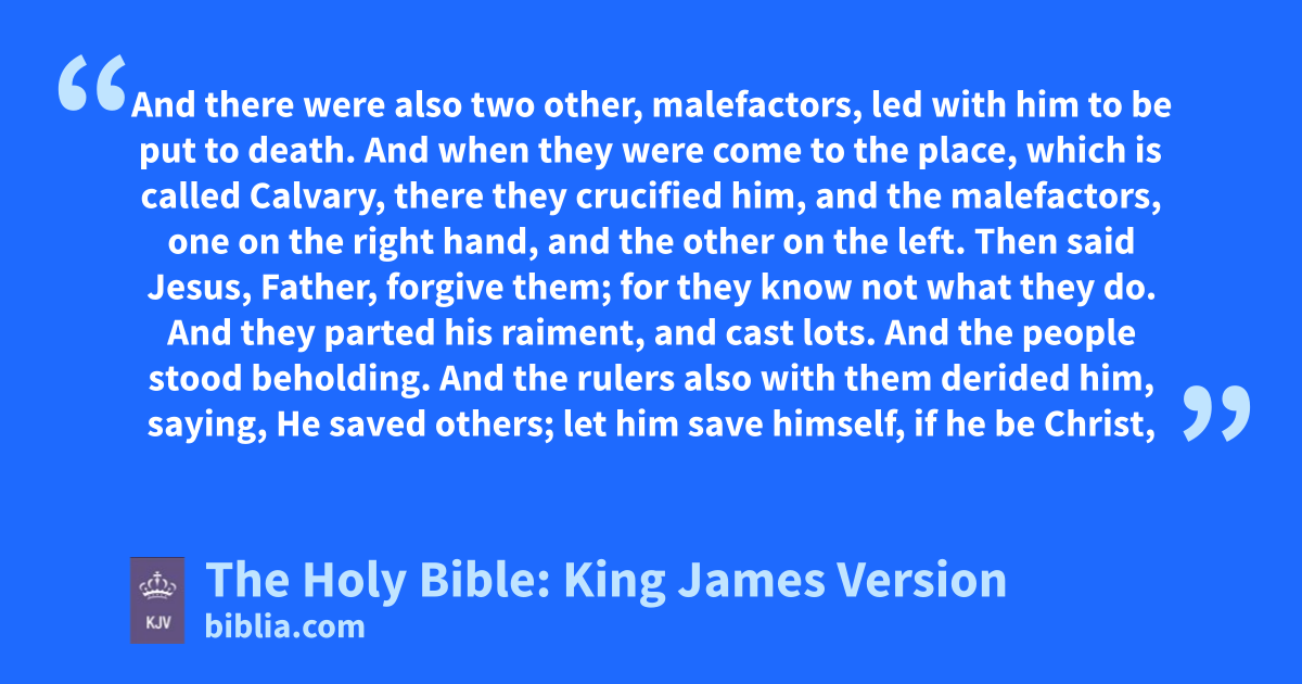 32 And there were also two other, malefactors, led with him to be put to death. 33 And when they were come to the place, which is called Calvarya, there they crucified him, and the malefactors, one on the right hand, and the other on the left. 34 Then said Jesus, Father, forgive them; for they know not what they do. And they parted his raiment, and cast lots. 35 And the people stood beholding. And the rulers also with them derided him, saying, He saved others; let him save himself, if he be Christ, the chosen of God. 36 And the soldiers also mocked him, coming to him, and offering him vinegar, 37 And saying, If thou be the king of the Jews, save thyself. 38 And a superscription also was written over him in letters of Greek, and Latin, and Hebrew, THIS IS THE KING OF THE JEWS. 39 And one of the malefactors which were hanged railed on him, saying, If thou be Christ, save thyself and us. 40 But the other answering rebuked him, saying, Dost not thou fear God, seeing thou art in the same condemnation? 41 And we indeed justly; for we receive the due reward of our deeds: but this man hath done nothing amiss. 42 And he said unto Jesus, Lord, remember me when thou comest into thy kingdom. 43 And Jesus said unto him, Verily I say unto thee, To day shalt thou be with me in paradise.