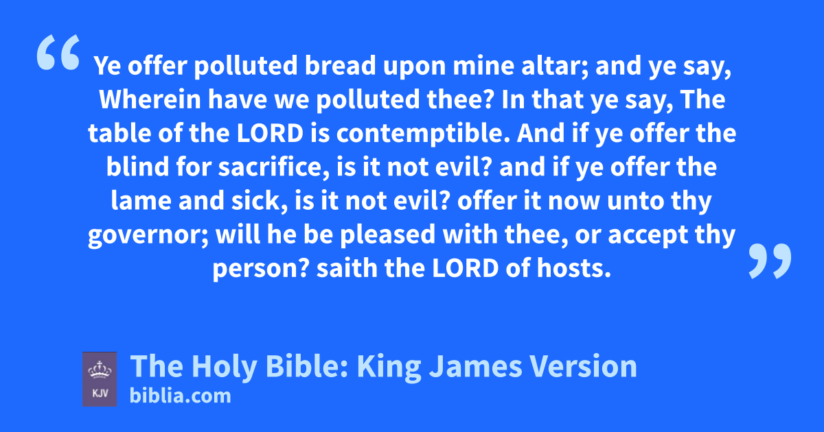 6 A son honoureth his father, and a servant his master: if then I be a father, where is mine honour? and if I be a master, where is my fear? saith the LORD of hosts unto you, O priests, that despise my name. And ye say, Wherein have we despised thy name? 7 Ye offerb polluted bread upon mine altar; and ye say, Wherein have we polluted thee? In that ye say, The table of the LORD is contemptible. 8 And if ye offer the blind for sacrifice, is it not evil? and if ye offer the lame and sick, is it not evil? offer it now unto thy governor; will he be pleased with thee, or accept thy person? saith the LORD of hosts. 9 And now, I pray you, beseech Godc that he will be gracious unto us: this hath been by your means: will he regard your persons? saith the LORD of hosts. 10 Who is there even among you that would shut the doors for nought? neither do ye kindle fire on mine altar for nought. I have no pleasure in you, saith the LORD of hosts, neither will I accept an offering at your hand. 11 For from the rising of the sun even unto the going down of the same my name shall be great among the Gentiles; and in every place incense shall be offered unto my name, and a pure offering: for my name shall be great among the heathen, saith the LORD of hosts. 12 But ye have profaned it, in that ye say, The table of the LORD is polluted; and the fruit thereof, even his meat, is contemptible. 13 Ye said also, Behold, what a weariness is it! and ye have snuffed at it, saith the LORD of hosts; and ye brought that which was torn, and the lame, and the sick; thus ye brought an offering: should I accept this of your hand? saith the LORD. 14 But cursed be the deceiver, whichd hath in his flock a male, and voweth, and sacrificeth unto the Lord a corrupt thing: for I am a great King, saith the LORD of hosts, and my name is dreadful among the heathen.