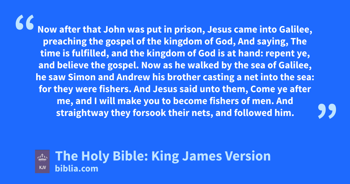 14 Now after that John was put in prison, Jesus came into Galilee, preaching the gospel of the kingdom of God, 15 And saying, The time is fulfilled, and the kingdom of God is at hand: repent ye, and believe the gospel. 16 Now as he walked by the sea of Galilee, he saw Simon and Andrew his brother casting a net into the sea: for they were fishers. 17 And Jesus said unto them, Come ye after me, and I will make you to become fishers of men. 18 And straightway they forsook their nets, and followed him. 19 And when he had gone a little further thence, he saw James the son of Zebedee, and John his brother, who also were in the ship mending their nets. 20 And straightway he called them: and they left their father Zebedee in the ship with the hired servants, and went after him. 21 And they went into Capernaum; and straightway on the sabbath day he entered into the synagogue, and taught. 22 And they were astonished at his doctrine: for he taught them as one that had authority, and not as the scribes.