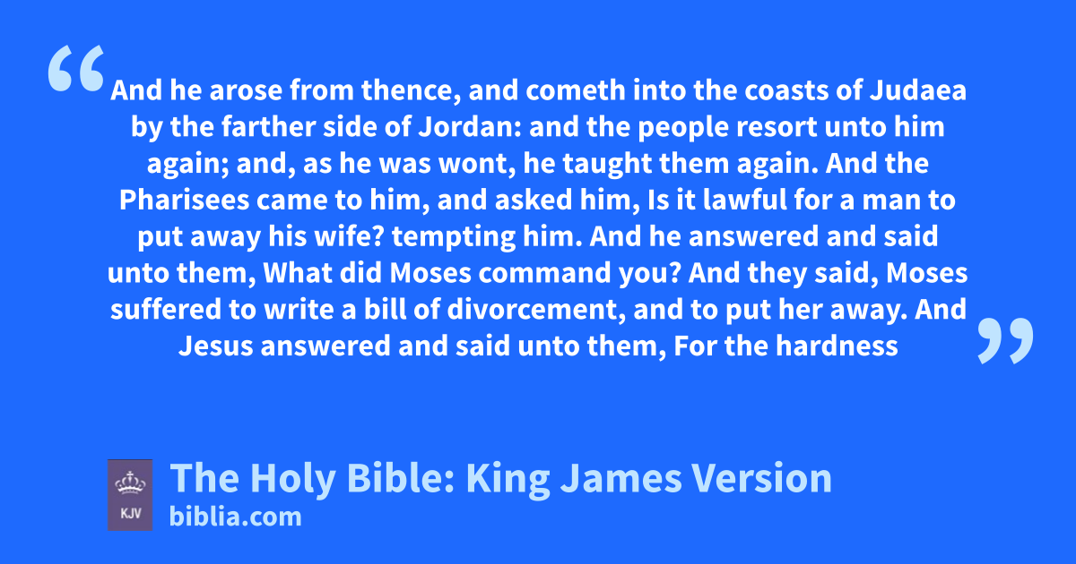 1 And he arose from thence, and cometh into the coasts of Judaea by the farther side of Jordan: and the people resort unto him again; and, as he was wont, he taught them again. 2 And the Pharisees came to him, and asked him, Is it lawful for a man to put away his wife? tempting him. 3 And he answered and said unto them, What did Moses command you? 4 And they said, Moses suffered to write a bill of divorcement, and to put her away. 5 And Jesus answered and said unto them, For the hardness of your heart he wrote you this precept. 6 But from the beginning of the creation God made them male and female. 7 For this cause shall a man leave his father and mother, and cleave to his wife; 8 And they twain shall be one flesh: so then they are no more twain, but one flesh. 9 What therefore God hath joined together, let not man put asunder. 10 And in the house his disciples asked him again of the same matter. 11 And he saith unto them, Whosoever shall put away his wife, and marry another, committeth adultery against her. 12 And if a woman shall put away her husband, and be married to another, she committeth adultery.