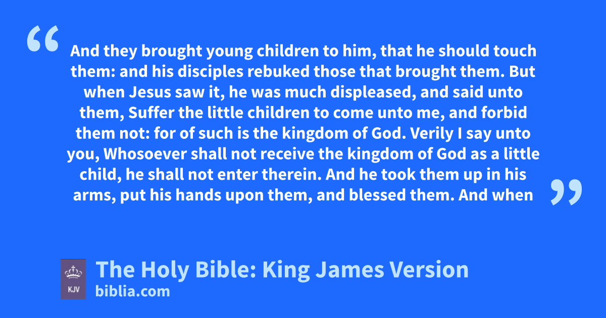 13 And they brought young children to him, that he should touch them: and his disciples rebuked those that brought them. 14 But when Jesus saw it, he was much displeased, and said unto them, Suffer the little children to come unto me, and forbid them not: for of such is the kingdom of God. 15 Verily I say unto you, Whosoever shall not receive the kingdom of God as a little child, he shall not enter therein. 16 And he took them up in his arms, put his hands upon them, and blessed them.