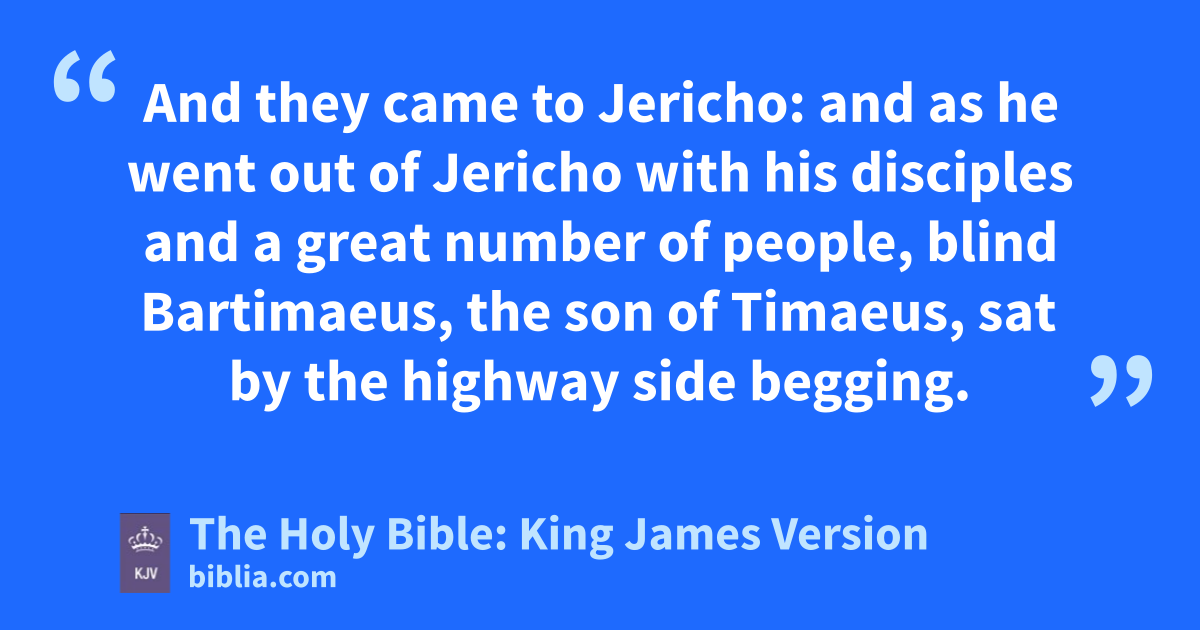 46 And they came to Jericho: and as he went out of Jericho with his disciples and a great number of people, blind Bartimaeus, the son of Timaeus, sat by the highway side begging. 47 And when he heard that it was Jesus of Nazareth, he began to cry out, and say, Jesus, thou Son of David, have mercy on me. 48 And many charged him that he should hold his peace: but he cried the more a great deal, Thou Son of David, have mercy on me. 49 And Jesus stood still, and commanded him to be called. And they call the blind man, saying unto him, Be of good comfort, rise; he calleth thee. 50 And he, casting away his garment, rose, and came to Jesus. 51 And Jesus answered and said unto him, What wilt thou that I should do unto thee?† The blind man said unto him, Lord, that I might receive my sight. 52 And Jesus said unto him, Go thy way; thy faith hath madea thee whole. And immediately he received his sight, and followed Jesus in the way.