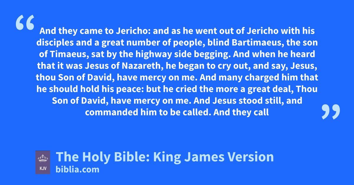 46 And they came to Jericho: and as he went out of Jericho with his disciples and a great number of people, blind Bartimaeus, the son of Timaeus, sat by the highway side begging. 47 And when he heard that it was Jesus of Nazareth, he began to cry out, and say, Jesus, thou Son of David, have mercy on me. 48 And many charged him that he should hold his peace: but he cried the more a great deal, Thou Son of David, have mercy on me. 49 And Jesus stood still, and commanded him to be called. And they call the blind man, saying unto him, Be of good comfort, rise; he calleth thee. 50 And he, casting away his garment, rose, and came to Jesus. 51 And Jesus answered and said unto him, What wilt thou that I should do unto thee?† The blind man said unto him, Lord, that I might receive my sight. 52 And Jesus said unto him, Go thy way; thy faith hath madea thee whole. And immediately he received his sight, and followed Jesus in the way.
