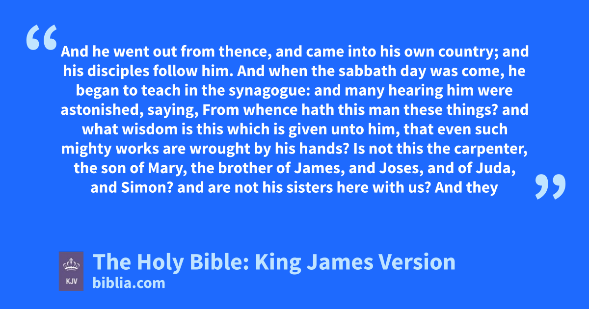 1 And he went out from thence, and came into his own country; and his disciples follow him. 2 And when the sabbath day was come, he began to teach in the synagogue: and many hearing him were astonished, saying, From whence hath this man these things? and what wisdom is this which is given unto him, that even such mighty works are wrought by his hands? 3 Is not this the carpenter, the son of Mary, the brother of James, and Joses, and of Juda, and Simon? and are not his sisters here with us? And they were offendeda at him. 4 But Jesus said unto them, A prophet is not without honour, but in his own country, and among his own kin, and in his own house. 5 And he could there do no mighty work, save that he laid his hands upon a few sick folk, and healed them. 6 And he marvelled because of their unbelief. And he went round about the villages, teaching.