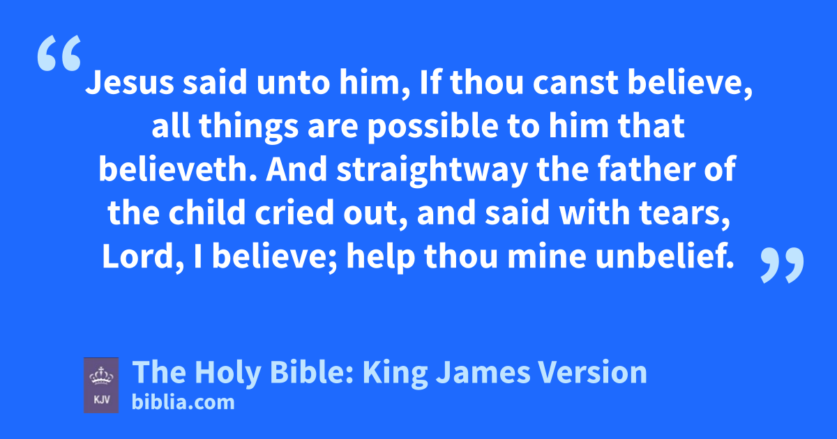 14 And when he came to his disciples, he saw a great multitude about them, and the scribes questioning with them. 15 And straightway all the people, when they beheld him, were greatly amazed, and running to him saluted him. 16 And he asked the scribes, What question ye with thema? 17 And one of the multitude answered and said, Master, I have brought unto thee my son, which hath a dumb spirit; 18 And wheresoever he taketh him, he tearethb him: and he foameth, and gnasheth with his teeth, and pineth away: and I spake to thy disciples that they should cast him out; and they could not. 19 He answereth him, and saith, O faithless generation, how long shall I be with you? how long shall I suffer you? bring him unto me. 20 And they brought him unto him: and when he saw him, straightway the spirit tare him; and he fell on the ground, and wallowed foaming. 21 And he asked his father, How long is it ago since this came unto him? And he said, Of a child. 22 And ofttimes it hath cast him into the fire, and into the waters, to destroy him: but if thou canst do any thing, have compassion on us, and help us. 23 † Jesus said unto him, If thou canst believe, all things are possible to him that believeth. 24 And straightway the father of the child cried out, and said with tears, Lord, I believe; help thou mine unbelief. 25 When Jesus saw that the people came running together, he rebuked the foul spirit, saying unto him, Thou dumb and deaf spirit, I charge thee, come out of him, and enter no more into him. 26 And the spirit cried, and rent him sore, and came out of him: and he was as one dead; insomuch that many said, He is dead. 27 But Jesus took him by the hand, and lifted him up; and he arose. 28 And when he was come into the house, his disciples asked him privately, Why could not we cast him out? 29 And he said unto them, This kind can come forth by nothing, but by prayer and fasting.