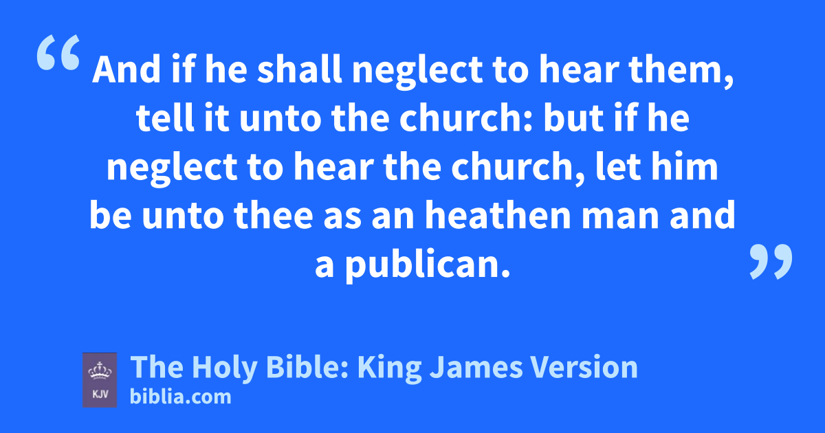 15 Moreover if thy brother shall trespass against thee, go and tell him his fault between thee and him alone: if he shall hear thee, thou hast gained thy brother. 16 But if he will not hear thee, then take with thee one or two more, that in the mouth of two or three witnesses every word may be established. 17 And if he shall neglect to hear them, tell it unto the church: but if he neglect to hear the church, let him be unto thee as an heathen man and a publican. 18 Verily I say unto you, Whatsoever ye shall bind on earth shall be bound in heaven: and whatsoever ye shall loose on earth shall be loosed in heaven. 19 Again I say unto you, That if two of you shall agree on earth as touching any thing that they shall ask, it shall be done for them of my Father which is in heaven. 20 For where two or three are gathered together in my name, there am I in the midst of them.