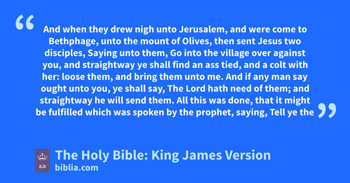 1 And when they drew nigh unto Jerusalem, and were come to Bethphage, unto the mount of Olives, then sent Jesus two disciples, 2 Saying unto them, Go into the village over against you, and straightway ye shall find an ass tied, and a colt with her: loose them, and bring them unto me. 3 And if any man say ought unto you, ye shall say, The Lord hath need of them; and straightway he will send them. 4 All this was done, that it might be fulfilled which was spoken by the prophet, saying, 5 Tell ye the daughter of Sion, Behold, thy King cometh unto thee, meek, and sitting upon an ass, and a colt the foal of an ass. 6 And the disciples went, and did as Jesus commanded them, 7 And brought the ass, and the colt, and put on them their clothes, and they set him thereon. 8 And a very great multitude spread their garments in the way; others cut down branches from the trees, and strawed them in the way. 9 And the multitudes that went before, and that followed, cried, saying, Hosanna to the Son of David: Blessed is he that cometh in the name of the Lord; Hosanna in the highest. 10 And when he was come into Jerusalem, all the city was moved, saying, Who is this? 11 And the multitude said, This is Jesus the prophet of Nazareth of Galilee.