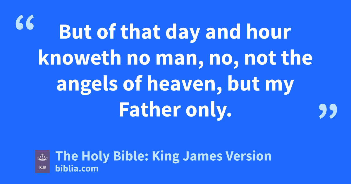 32 Now learn a parable of the fig tree; When his branch is yet tender, and putteth forth leaves, ye know that summer is nigh: 33 So likewise ye, when ye shall see all these things, know that it is near, even at the doors. 34 Verily I say unto you, This generation shall not pass, till all these things be fulfilled. 35 Heaven and earth shall pass away, but my words shall not pass away. 36 But of that day and hour knoweth no man, no, not the angels of heaven, but my Father only. 37 But as the days of Noe were, so shall also the coming of the Son of man be. 38 For as in the days that were before the flood they were eating and drinking, marrying and giving in marriage, until the day that Noe entered into the ark, 39 And knew not until the flood came, and took them all away; so shall also the coming of the Son of man be. 40 Then shall two be in the field; the one shall be taken, and the other left. 41 Two women shall be grinding at the mill; the one shall be taken, and the other left. 42 Watch therefore: for ye know not what hour your Lord doth come. 43 But know this, that if the goodman of the house had known in what watch the thief would come, he would have watched, and would not have suffered his house to be broken up. 44 Therefore be ye also ready: for in such an hour as ye think not the Son of man cometh. 45 Who then is a faithful and wise servant, whom his lord hath made ruler over his household, to give them meat in due season? 46 Blessed is that servant, whom his lord when he cometh shall find so doing. 47 Verily I say unto you, That he shall make him ruler over all his goods. 48 But and if that evil servant shall say in his heart, My lord delayeth his coming; 49 And shall begin to smite his fellowservants, and to eat and drink with the drunken; 50 The lord of that servant shall come in a day when he looketh not for him, and in an hour that he is not aware of, 51 And shall cutb him asunder, and appoint him his portion with the hypocrites: there shall be weeping and gnashing of teeth.
