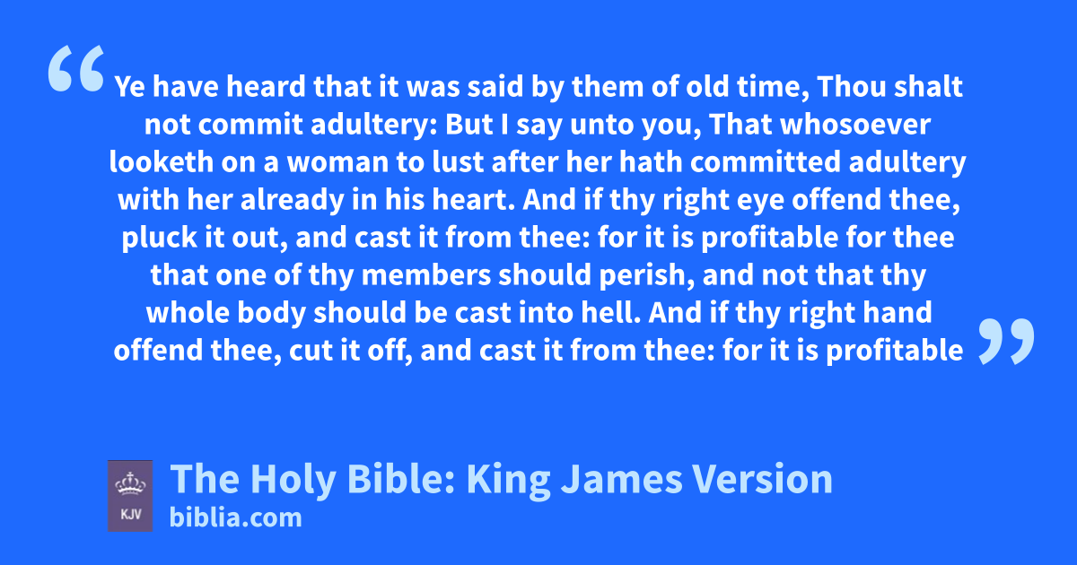 27 Ye have heard that it was said by them of old time, Thou shalt not commit adultery: 28 But I say unto you, That whosoever looketh on a woman to lust after her hath committed adultery with her already in his heart. 29 And if thy right eye offendd thee, pluck it out, and cast it from thee: for it is profitable for thee that one of thy members should perish, and not that thy whole body should be cast into hell. 30 And if thy right hand offend thee, cut it off, and cast it from thee: for it is profitable for thee that one of thy members should perish, and not that thy whole body should be cast into hell. 31 † It hath been said, Whosoever shall put away his wife, let him give her a writing of divorcement: 32 But I say unto you, That whosoever shall put away his wife, saving for the cause of fornication, causeth her to commit adultery: and whosoever shall marry her that is divorced committeth adultery.