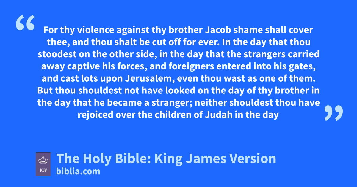 10 For thy violence against thy brother Jacob shame shall cover thee, and thou shalt be cut off for ever. 11 In the day that thou stoodest on the other side, in the day that the strangers carried away captivea his forces, and foreigners entered into his gates, and cast lots upon Jerusalem, even thou wast as one of them. 12 But thou shouldest not have looked on the day of thy brother in the day that he became a stranger; neither shouldest thou have rejoiced over the children of Judah in the day of their destruction; neither shouldest thou have spokenb proudly in the day of distress. 13 Thou shouldest not have entered into the gate of my people in the day of their calamity; yea, thou shouldest not have looked on their affliction in the day of their calamity, nor have laid hands on their substancec in the day of their calamity; 14 Neither shouldest thou have stood in the crossway, to cut off those of his that did escape; neither shouldest thou have delivered upd those of his that did remain in the day of distress. 15 For the day of the LORD is near upon all the heathen: as thou hast done, it shall be done unto thee: thy reward shall return upon thine own head. 16 For as ye have drunk upon my holy mountain, so shall all the heathen drink continually, yea, they shall drink, and they shall swallow down, and they shall be as though they had not been.