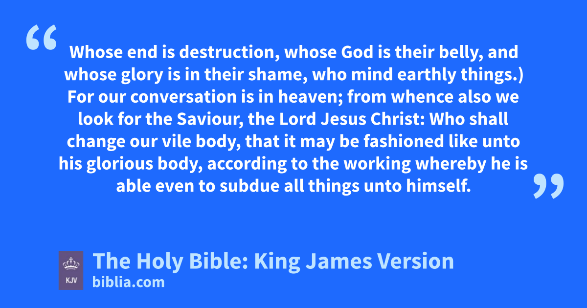 17 Brethren, be followers together of me, and mark them which walk so as ye have us for an ensample. 18 (For many walk, of whom I have told you often, and now tell you even weeping, that they are the enemies of the cross of Christ: 19 Whose end is destruction, whose God is their belly, and whose glory is in their shame, who mind earthly things.) 20 For our conversationa is in heaven; from whence also we look for the Saviour, the Lord Jesus Christ: 21 Who shall change our vile body, that it may be fashioned like unto his glorious body, according to the working whereby he is able even to subdue all things unto himself.