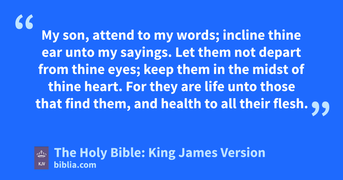 20 My son, attend to my words; incline thine ear unto my sayings. 21 Let them not depart from thine eyes; keep them in the midst of thine heart. 22 For they are life unto those that find them, and healthb to all their flesh. 23 Keep thy heart with all diligence; for out of it are the issues of life. 24 Put away from thee a frowardc mouth, and perverse lips put far from thee. 25 Let thine eyes look right on, and let thine eyelids look straight before thee. 26 Ponder the path of thy feet, and let all thy ways be established. 27 Turn not to the right hand nor to the left: remove thy foot from evil.