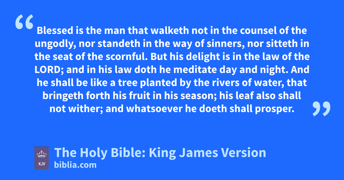 1 Blessed is the man that walketh not in the counsel of the ungodlya, nor standeth in the way of sinners, nor sitteth in the seat of the scornful. 2 But his delight is in the law of the LORD; and in his law doth he meditate day and night. 3 And he shall be like a tree planted by the rivers of water, that bringeth forth his fruit in his season; his leaf also shall not witherb; and whatsoever he doeth shall prosper.