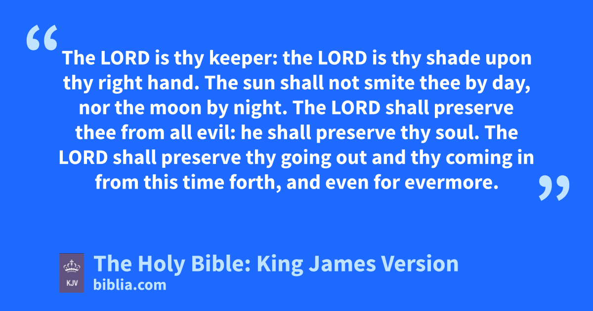 1 I will lift up mine eyes unto the hills, from whence cometh my help. 2 My help cometh from the LORD, which made heaven and earth. 3 He will not suffer thy foot to be moved: he that keepeth thee will not slumber. 4 Behold, he that keepeth Israel shall neither slumber nor sleep. 5 The LORD is thy keeper: the LORD is thy shade upon thy right hand. 6 The sun shall not smite thee by day, nor the moon by night. 7 The LORD shall preserve thee from all evil: he shall preserve thy soul. 8 The LORD shall preserve thy going out and thy coming in from this time forth, and even for evermore.