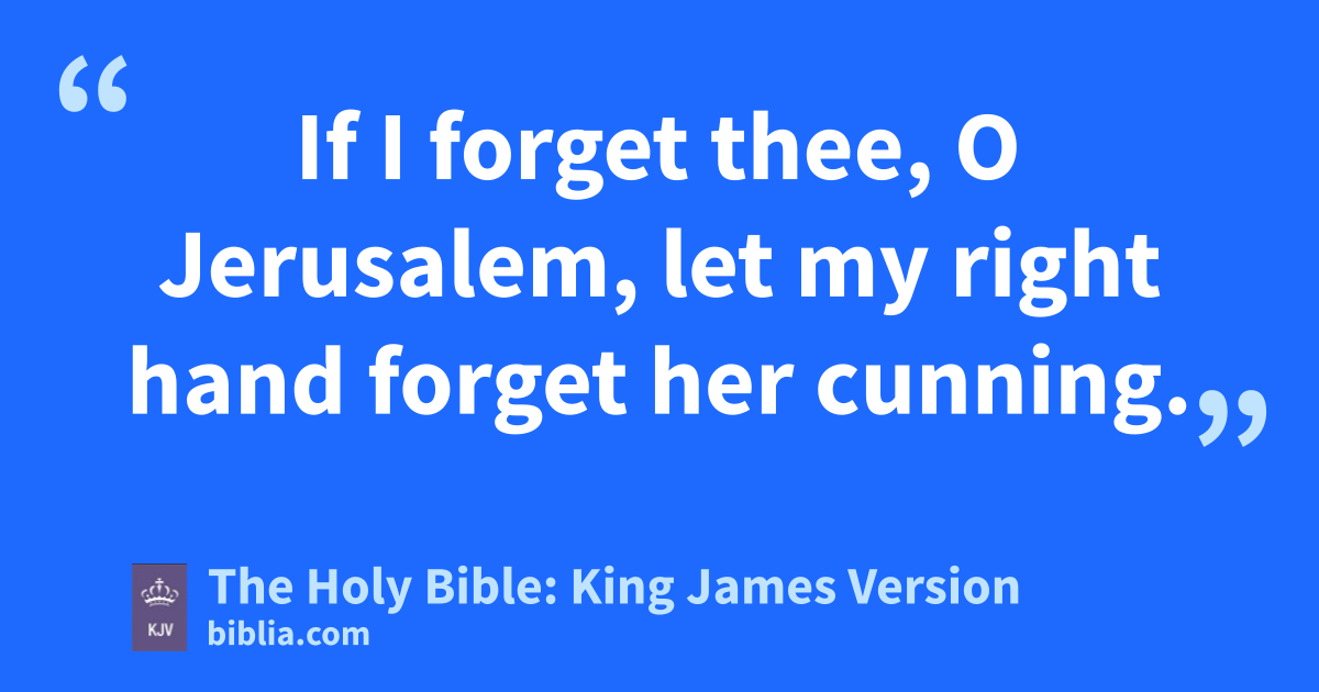 1 By the rivers of Babylon, there we sat down, yea, we wept, when we remembered Zion. 2 We hanged our harps upon the willows in the midst thereof. 3 For there they that carried us away captive required of us a songa; and they that wasted us required of us mirth, saying, Sing us one of the songs of Zion. 4 How shall we sing the LORD’S song in a strangeb land? 5 If I forget thee, O Jerusalem, let my right hand forget her cunning. 6 If I do not remember thee, let my tongue cleave to the roof of my mouth; if I prefer not Jerusalem above my chiefc joy.