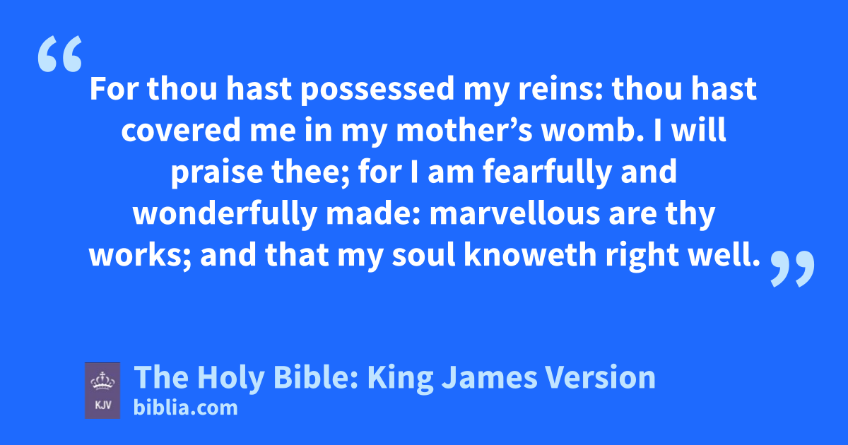 7 Whither shall I go from thy spirit? or whither shall I flee from thy presence? 8 If I ascend up into heaven, thou art there: if I make my bed in hell, behold, thou art there. 9 If I take the wings of the morning, and dwell in the uttermost parts of the sea; 10 Even there shall thy hand lead me, and thy right hand shall hold me. 11 If I say, Surely the darkness shall cover me; even the night shall be light about me. 12 Yea, the darkness hidethb not from thee; but the night shineth as the day: the darkness and the light are both alike to thee. 13 For thou hast possessed my reins: thou hast covered me in my mother’s womb. 14 I will praise thee; for I am fearfully and wonderfully made: marvellous are thy works; and that my soul knoweth right well. 15 My substancec was not hid from thee, when I was made in secret, and curiously wrought in the lowest parts of the earth. 16 Thine eyes did see my substance, yet being unperfect; and in thy book all my members were writtend, which in continuance were fashioned, when as yet there was none of them.