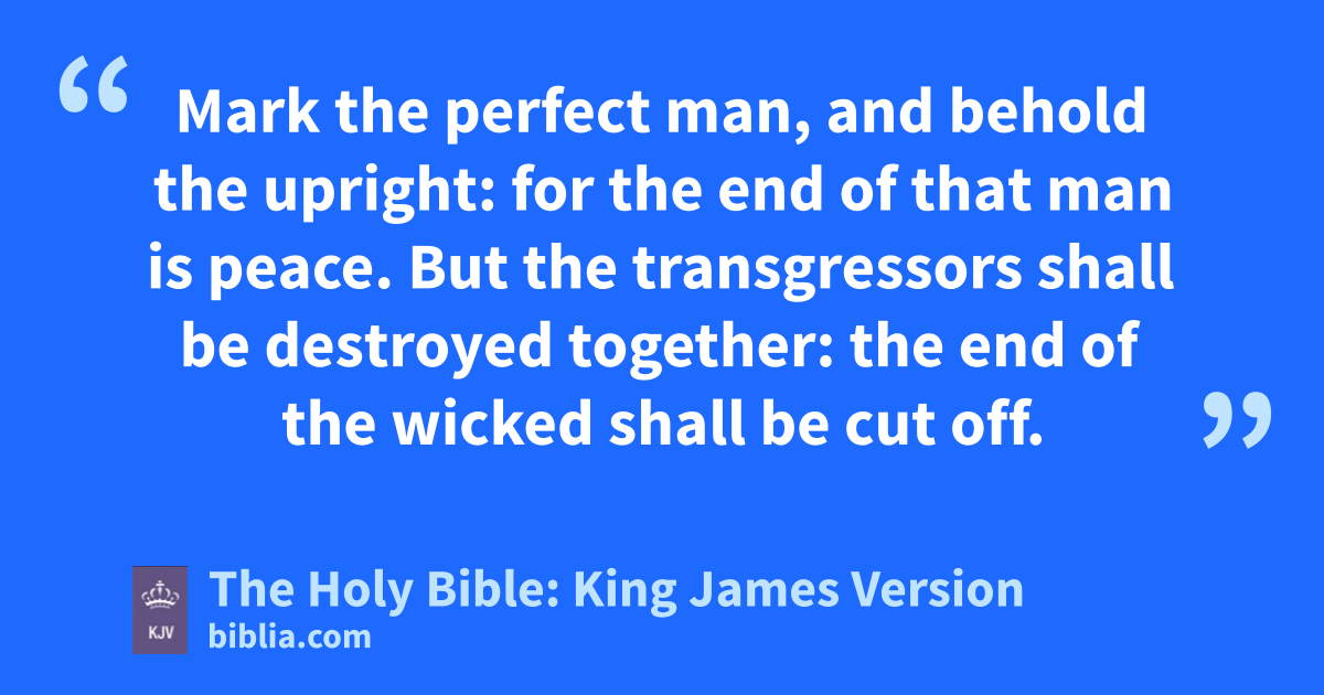 34 Wait on the LORD, and keep his way, and he shall exalt thee to inherit the land: when the wicked are cut off, thou shalt see it. 35 I have seen the wicked in great power, and spreading himself like a greenh bay tree. 36 Yet he passed away, and, lo, he was not: yea, I sought him, but he could not be found. 37 Mark the perfect man, and behold the upright: for the end of that man is peace. 38 But the transgressors shall be destroyed together: the end of the wicked shall be cut off. 39 But the salvation of the righteous is of the LORD: he is their strength in the time of trouble. 40 And the LORD shall help them, and deliver them: he shall deliver them from the wicked, and save them, because they trust in him.
