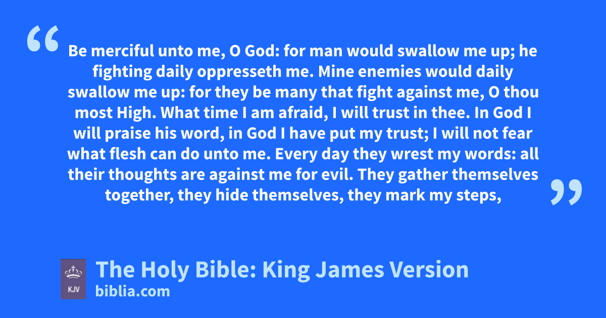 1 Be merciful unto me, O God: for man would swallow me up; he fighting daily oppresseth me. 2 Mine enemiesb would daily swallow me up: for they be many that fight against me, O thou most High. 3 What time I am afraid, I will trust in thee. 4 In God I will praise his word, in God I have put my trust; I will not fear what flesh can do unto me. 5 Every day they wrest my words: all their thoughts are against me for evil. 6 They gather themselves together, they hide themselves, they mark my steps, when they wait for my soul. 7 Shall they escape by iniquity? in thine anger cast down the people, O God.
