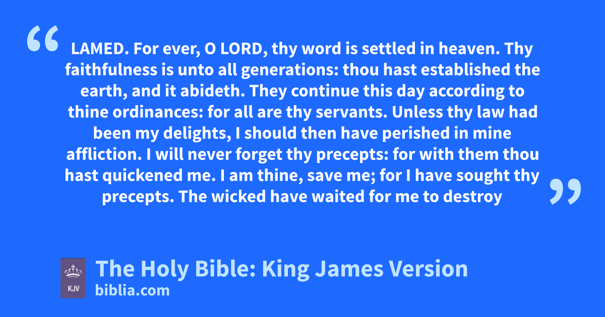 89 LAMED. For ever, O LORD, thy word is settled in heaven. 90 Thy faithfulness is unto all generations: thou hast established the earth, and it abideth. 91 They continue this day according to thine ordinances: for all are thy servants.