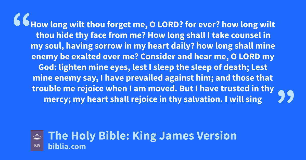 1 How long wilt thou forget me, O LORD? for ever? how long wilt thou hide thy face from me? 2 How long shall I take counsel in my soul, having sorrow in my heart daily? how long shall mine enemy be exalted over me? 3 Consider and hear me, O LORD my God: lighten mine eyes, lest I sleep the sleep of death; 4 Lest mine enemy say, I have prevailed against him; and those that trouble me rejoice when I am moved. 5 But I have trusted in thy mercy; my heart shall rejoice in thy salvation. 6 I will sing unto the LORD, because he hath dealt bountifully with me.