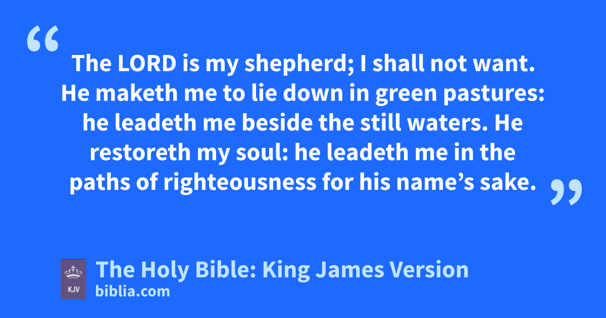 1 The LORD is my shepherd; I shall not want. 2 He maketh me to lie down in greena pastures: he leadeth me beside the still waters. 3 He restoreth my soul: he leadeth me in the paths of righteousness for his name’s sake. 4 Yea, though I walk through the valley of the shadow of death, I will fear no evil: for thou art with me; thy rod and thy staff they comfort me. 5 Thou preparest a table before me in the presence of mine enemies: thou anointestb my head with oil; my cup runneth over. 6 Surely goodness and mercy shall follow me all the days of my life: and I will dwell in the house of the LORD for everc.