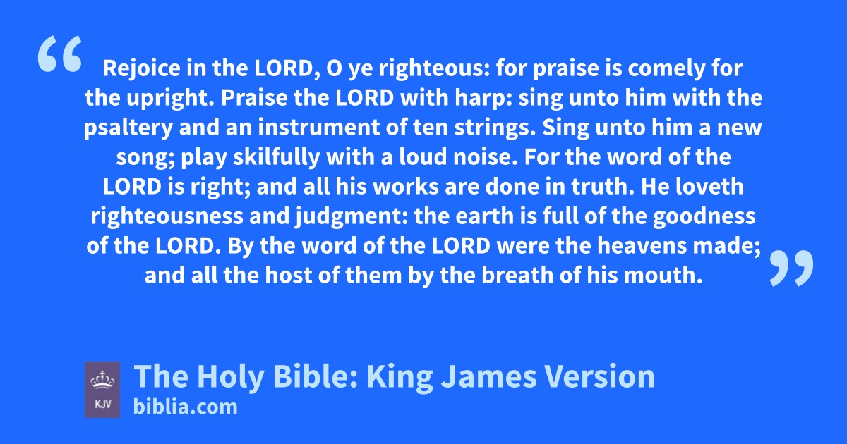 1 Rejoice in the LORD, O ye righteous: for praise is comely for the upright. 2 Praise the LORD with harp: sing unto him with the psaltery and an instrument of ten strings. 3 Sing unto him a new song; play skilfully with a loud noise. 4 For the word of the LORD is right; and all his works are done in truth. 5 He loveth righteousness and judgment: the earth is full of the goodnessa of the LORD. 6 By the word of the LORD were the heavens made; and all the host of them by the breath of his mouth. 7 He gathereth the waters of the sea together as an heap: he layeth up the depth in storehouses. 8 Let all the earth fear the LORD: let all the inhabitants of the world stand in awe of him. 9 For he spake, and it was done; he commanded, and it stood fast. 10 The LORD bringethb the counsel of the heathen to nought: he maketh the devices of the people of none effect. 11 The counsel of the LORD standeth for ever, the thoughts of his heart to allc generations.