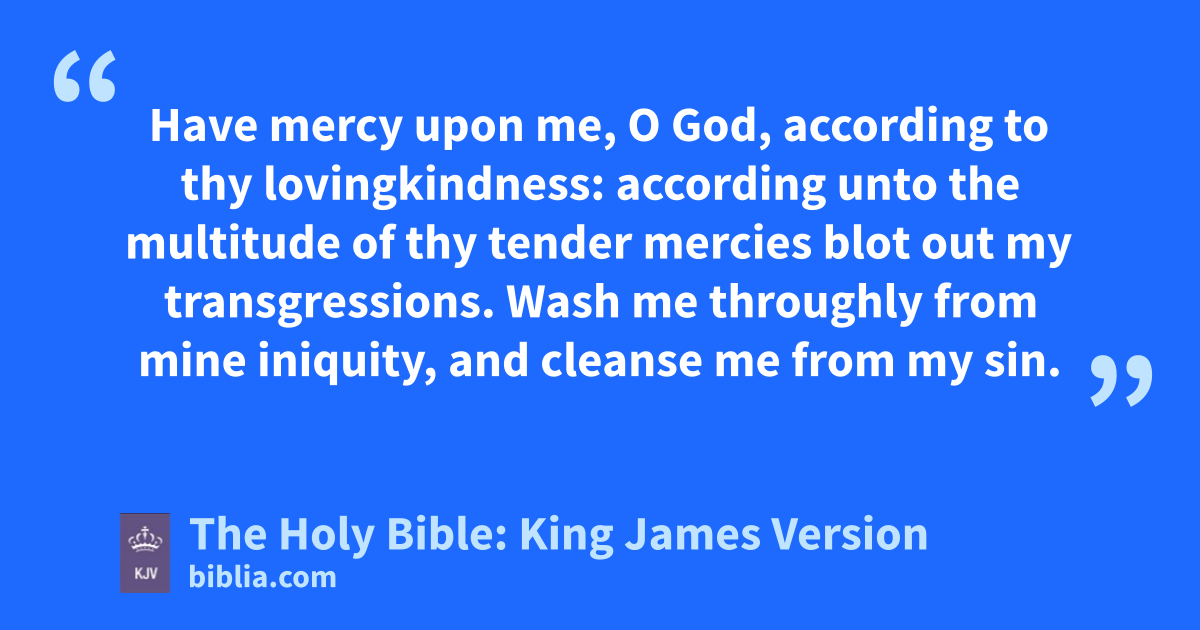 1 Have mercy upon me, O God, according to thy lovingkindness: according unto the multitude of thy tender mercies blot out my transgressions. 2 Wash me throughly from mine iniquity, and cleanse me from my sin. 3 For I acknowledge my transgressions: and my sin is ever before me. 4 Against thee, thee only, have I sinned, and done this evil in thy sight: that thou mightest be justified when thou speakest, and be clear when thou judgest. 5 Behold, I was shapen in iniquity; and in sin did my mother conceivea me. 6 Behold, thou desirest truth in the inward parts: and in the hidden part thou shalt make me to know wisdom.