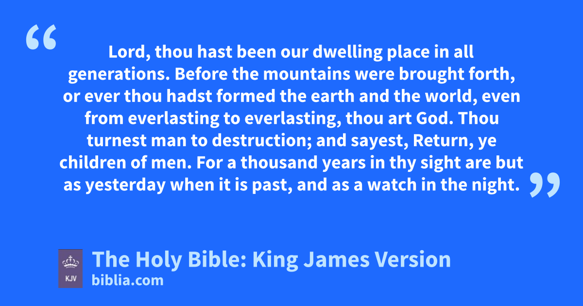 1 Lord, thou hast been our dwelling place in all generations. 2 Before the mountains were brought forth, or ever thou hadst formed the earth and the world, even from everlasting to everlasting, thou art God. 3 Thou turnest man to destruction; and sayest, Return, ye children of men. 4 For a thousand years in thy sight are but as yesterday when it is past, and as a watch in the night. 5 Thou carriest them away as with a flood; they are as a sleep: in the morning they are like grass which groweth up. 6 In the morning it flourisheth, and groweth up; in the evening it is cut down, and withereth.