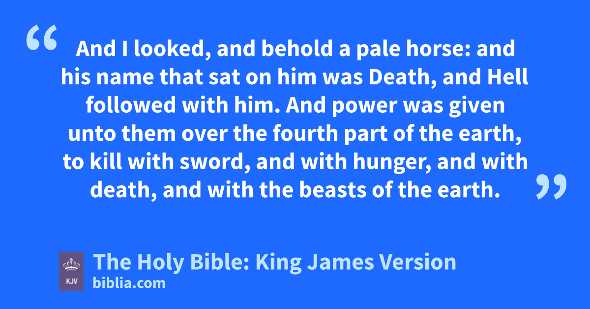 3 And when he had opened the second seal, I heard the second beast say, Come and see. 4 And there went out another horse that was red: and power was given to him that sat thereon to take peace from the earth, and that they should kill one another: and there was given unto him a great sword. 5 And when he had opened the third seal, I heard the third beast say, Come and see. And I beheld, and lo a black horse; and he that sat on him had a pair of balances in his hand. 6 And I heard a voice in the midst of the four beasts say, A measurea of wheat for a penny, and three measures of barley for a penny; and see thou hurt not the oil and the wine. 7 And when he had opened the fourth seal, I heard the voice of the fourth beast say, Come and see. 8 And I looked, and behold a pale horse: and his name that sat on him was Death, and Hell followed with him. And power was given unto themb over the fourth part of the earth, to kill with sword, and with hunger, and with death, and with the beasts of the earth.