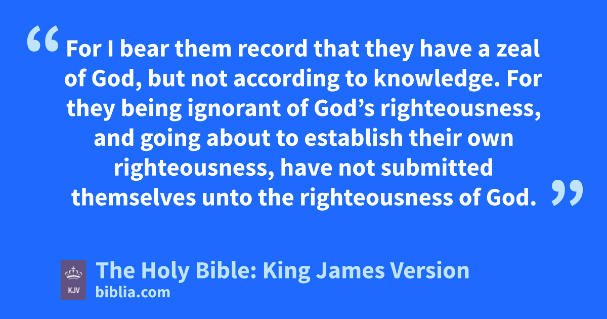 1 Brethren, my heart’s desire and prayer to God for Israel is, that they might be saved. 2 For I bear them record that they have a zeal of God, but not according to knowledge. 3 For they being ignorant of God’s righteousness, and going about to establish their own righteousness, have not submitted themselves unto the righteousness of God. 4 For Christ is the end of the law for righteousness to every one that believeth. 5 For Moses describeth the righteousness which is of the law, That the man which doeth those things shall live by them. 6 But the righteousness which is of faith speaketh on this wise, Say not in thine heart, Who shall ascend into heaven? (that is, to bring Christ down from above:) 7 Or, Who shall descend into the deep? (that is, to bring up Christ again from the dead.) 8 But what saith it? The word is nigh thee, even in thy mouth, and in thy heart: that is, the word of faith, which we preach; 9 That if thou shalt confess with thy mouth the Lord Jesus, and shalt believe in thine heart that God hath raised him from the dead, thou shalt be saved. 10 For with the heart man believeth unto righteousness; and with the mouth confession is made unto salvation. 11 For the scripture saith, Whosoever believeth on him shall not be ashamed.