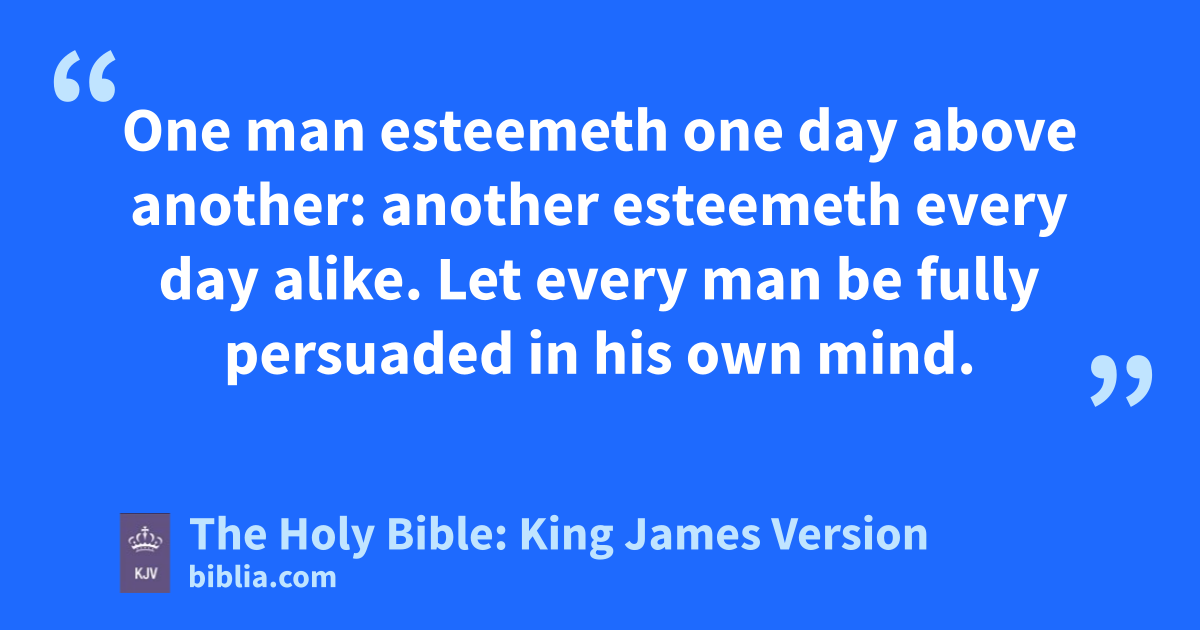 1 Him that is weak in the faith receive ye, but† nota to doubtful disputations. 2 For one believeth that he may eat all things: another, who is weak, eateth herbs. 3 Let not him that eateth despise him that eateth not; and let not him which eateth not judge him that eateth: for God hath received him. 4 Who art thou that judgest another man’s servant? to his own master he standeth or falleth. Yea, he shall be holden up: for God is able to make him stand. 5 One man esteemeth one day above another: another esteemeth every day alike. Let every man be fully persuadedb in his own mind. 6 He that regardethc the day, regardeth it unto the Lord; and he that regardeth not the day, to the Lord he doth not regard it. He that eateth, eateth to the Lord, for he giveth God thanks; and he that eateth not, to the Lord he eateth not, and giveth God thanks. 7 For none of us liveth to himself, and no man dieth to himself. 8 For whether we live, we live unto the Lord; and whether we die, we die unto the Lord: whether we live therefore, or die, we are the Lord’s. 9 For to this end Christ both died, and rose, and revived, that he might be Lord both of the dead and living. 10 But why dost thou judge thy brother? or why dost thou set at nought thy brother? for we shall all stand before the judgment seat of Christ. 11 For it is written, As I live, saith the Lord, every knee shall bow to me, and every tongue shall confess to God. 12 So then every one of us shall give account of himself to God. 13 Let us not therefore judge one another any more: but judge this rather, that no man put a stumblingblock or an occasion to fall in his brother’s way. 14 I know, and am persuaded by the Lord Jesus, that there is nothing uncleand of itself: but to him that esteemeth any thing to be unclean, to him it is unclean. 15 But if thy brother be grieved with thy meat, now walkest thou not charitablye. Destroy not him with thy meat, for whom Christ died. 16 Let not then your good be evil spoken of: 17 For the kingdom of God is not meat and drink; but righteousness, and peace, and joy in the Holy Ghost. 18 For he that in these things serveth Christ is acceptable to God, and approved of men. 19 Let us therefore follow after the things which make for peace, and things wherewith one may edify another. 20 For meat destroy not the work of God. All things indeed are pure; but it is evil for that man who eateth with offence. 21 It is good neither to eat flesh, nor to drink wine, nor any thing whereby thy brother stumbleth, or is offended, or is made weak. 22 Hast thou faith? have it to thyself before God. Happy is he that condemneth not himself in that thing which he alloweth. 23 And he that doubtethf is damned if he eat, because he eateth not of faith: for whatsoever is not of faith is sin.