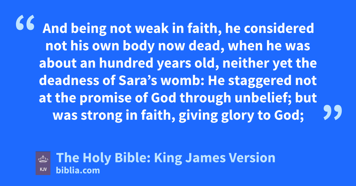17 (As it is written, I have made thee a father of many nations,) before him whom he believed, even God, who quickeneth the dead, and calleth those things which be not as though they were. 18 Who against hope believed in hope, that he might become the father of many nations, according to that which was spoken, So shall thy seed be. 19 And being not weak in faith, he considered not his own body now dead, when he was about an hundred years old, neither yet the deadness of Sara’s womb: 20 † He staggered not at the promise of God through unbelief; but was strong in faith, giving glory to God; 21 And being fully persuaded that, what he had promised, he was able also to perform. 22 And therefore it was imputed to him for righteousness.