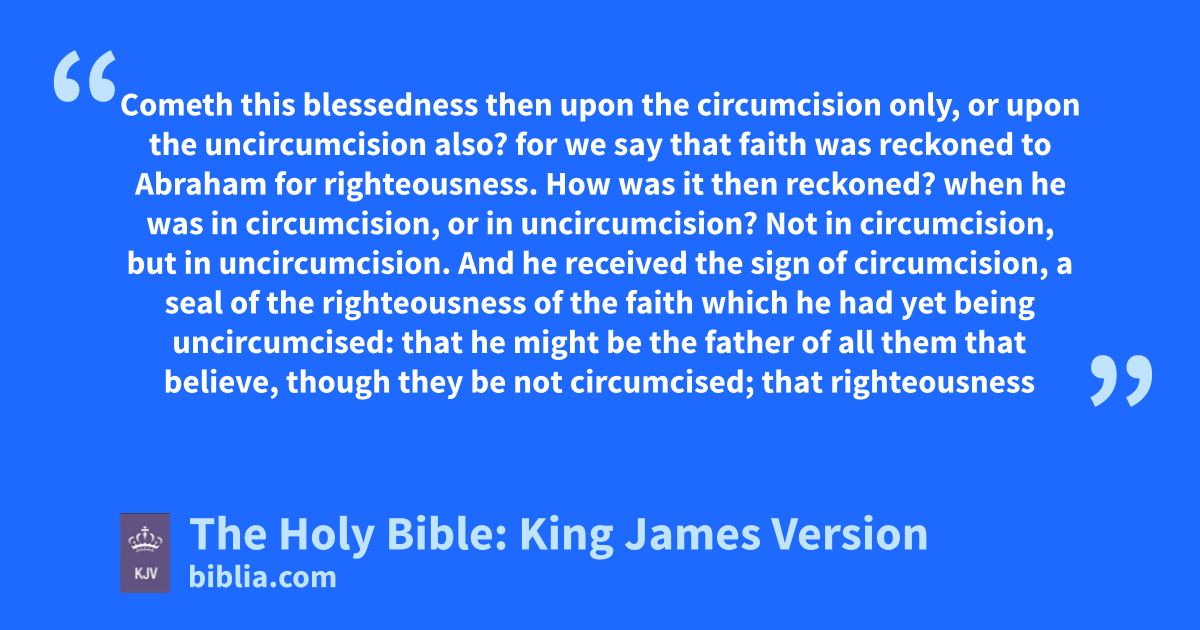 9 Cometh this blessedness then upon the circumcision only, or upon the uncircumcision also? for we say that faith was reckoned to Abraham for righteousness. 10 How was it then reckoned? when he was in circumcision, or in uncircumcision? Not in circumcision, but in uncircumcision. 11 And he received the sign of circumcision, a seal of the righteousness of the faith which he had yet being uncircumcised: that he might be the father of all them that believe, though they be not circumcised; that righteousness might be imputed unto them also: 12 And the father of circumcision to them who are not of the circumcision only, but who also walk in the steps of that faith of our father Abraham, which he had being yet uncircumcised. 13 For the promise, that he should be the heir of the world, was not to Abraham, or to his seed, through the law, but through the righteousness of faith. 14 For if they which are of the law be heirs, faith is made void, and the promise made of none effect: 15 Because the law worketh wrath: for where no law is, there is no transgression. 16 Therefore it is of faith, that it might be by grace; to the end the promise might be sure to all the seed; not to that only which is of the law, but to that also which is of the faith of Abraham; who is the father of us all,