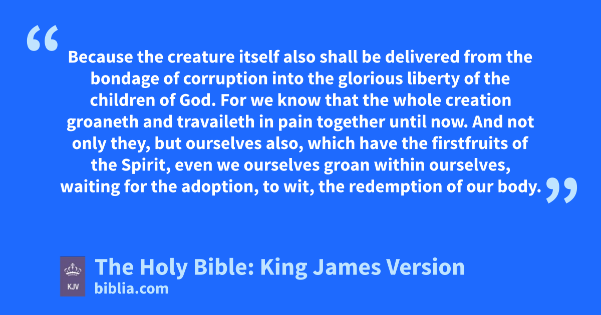 17 And if children, then heirs; heirs of God, and joint-heirs with Christ; if so be that we suffer with him, that we may be also glorified together. 18 For I reckon that the sufferings of this present time are not worthy to be compared with the glory which shall be revealed in us. 19 For the earnest expectation of the creature waiteth for the manifestation of the sons of God. 20 For the creature was made subject to vanity, not willingly, but by reason of him who hath subjected the same in hope, 21 Because the creature itself also shall be delivered from the bondage of corruption into the glorious liberty of the children of God. 22 For we know that the whole creation groaneth and travaileth in pain together until now. 23 And not only they, but ourselves also, which have the firstfruits of the Spirit, even we ourselves groan within ourselves, waiting for the adoption, to wit, the redemption of our body. 24 For we are saved by hope: but hope that is seen is not hope: for what a man seeth, why doth he yet hope for? 25 But if we hope for that we see not, then do we with patience wait for it.
