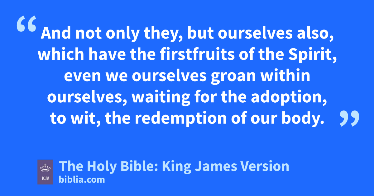 17 And if children, then heirs; heirs of God, and joint-heirs with Christ; if so be that we suffer with him, that we may be also glorified together. 18 For I reckon that the sufferings of this present time are not worthy to be compared with the glory which shall be revealed in us. 19 For the earnest expectation of the creature waiteth for the manifestation of the sons of God. 20 For the creature was made subject to vanity, not willingly, but by reason of him who hath subjected the same in hope, 21 Because the creature itself also shall be delivered from the bondage of corruption into the glorious liberty of the children of God. 22 For we know that the whole creation groaneth and travaileth in pain together until now. 23 And not only they, but ourselves also, which have the firstfruits of the Spirit, even we ourselves groan within ourselves, waiting for the adoption, to wit, the redemption of our body. 24 For we are saved by hope: but hope that is seen is not hope: for what a man seeth, why doth he yet hope for? 25 But if we hope for that we see not, then do we with patience wait for it.