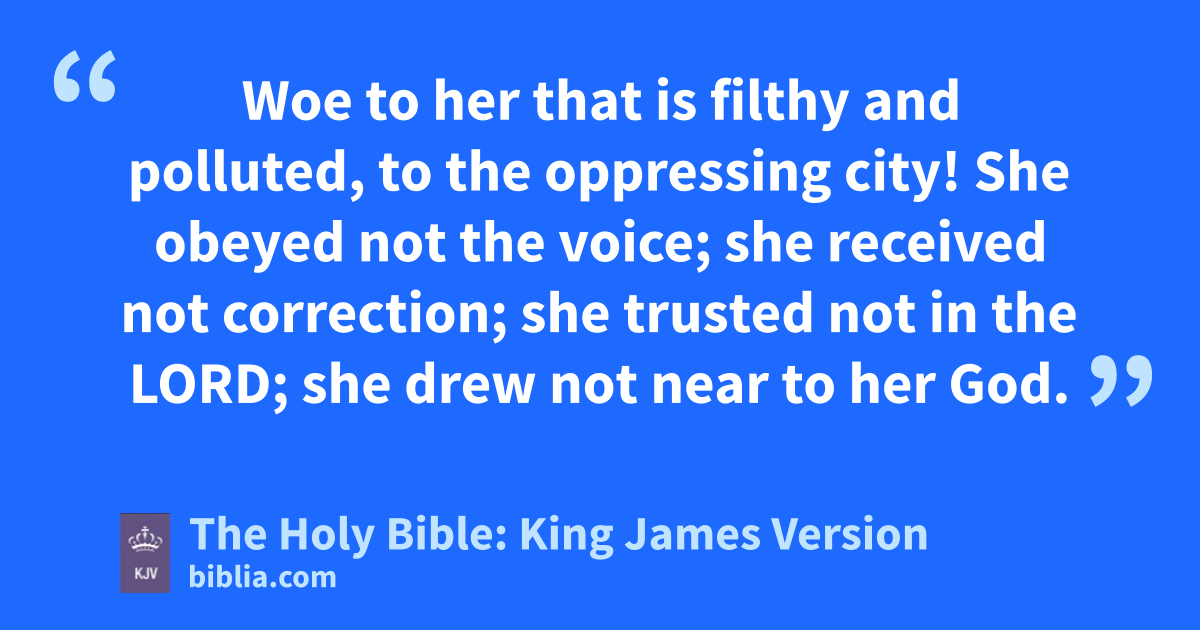 1 Woe to her that is filthy and polluted, to the oppressing city! 2 She obeyed not the voice; she received not correctiona; she trusted not in the LORD; she drew not near to her God. 3 Her princes within her are roaring lions; her judges are evening wolves; they gnaw not the bones till the morrow. 4 Her prophets are light and treacherous persons: her priests have polluted the sanctuary, they have done violence to the law. 5 The just LORD is in the midst thereof; he will not do iniquity: every morning doth he bring his judgment to light, he faileth not; but the unjust knoweth no shame. 6 I have cut off the nations: their towersb are desolate; I made their streets waste, that none passeth by: their cities are destroyed, so that there is no man, that there is none inhabitant. 7 I said, Surely thou wilt fear me, thou wilt receive instruction; so their dwelling should not be cut off, howsoever I punished them: but they rose early, and corrupted all their doings.