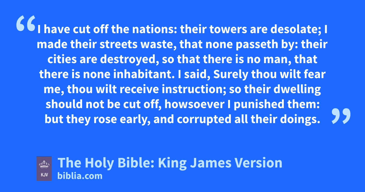 1 Woe to her that is filthy and polluted, to the oppressing city! 2 She obeyed not the voice; she received not correctiona; she trusted not in the LORD; she drew not near to her God. 3 Her princes within her are roaring lions; her judges are evening wolves; they gnaw not the bones till the morrow. 4 Her prophets are light and treacherous persons: her priests have polluted the sanctuary, they have done violence to the law. 5 The just LORD is in the midst thereof; he will not do iniquity: every morning doth he bring his judgment to light, he faileth not; but the unjust knoweth no shame. 6 I have cut off the nations: their towersb are desolate; I made their streets waste, that none passeth by: their cities are destroyed, so that there is no man, that there is none inhabitant. 7 I said, Surely thou wilt fear me, thou wilt receive instruction; so their dwelling should not be cut off, howsoever I punished them: but they rose early, and corrupted all their doings.