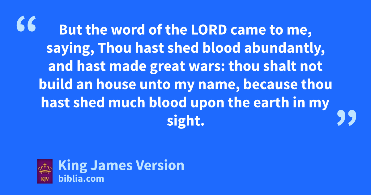 6 Then he called for Solomon his son, and charged him to build an house for the Lord God of Israel. 7 And David said to Solomon, My son, as for me, git was in my mind to build an house hunto the name of the Lord my God: 8 But the word of the Lord came to me, saying, iThou hast shed blood abundantly, and jhast made great wars: thou shalt not build an house unto my name, because thou hast shed much blood upon the earth in my sight. 9 Behold, a son shall be born to thee, who shall be a man of krest; and I will give him rest from all his enemies round about: for his name shall be ||Solomon, and I will give peace and quietness unto Israel in his days. 10 lHe shall build an house for my name; and mhe shall be my son, and I will be his father; and I will establish the throne of his kingdom over Israel for ever. 11 Now, my son, nthe Lord be with thee; and prosper thou, and build the house of the Lord thy God, as he hath said of thee. 12 Only the Lord ogive thee wisdom and understanding, and give thee charge concerning Israel, that thou mayest keep the law of the Lord thy God. 13 pThen shalt thou prosper, if thou takest heed to fulfil the statutes and judgments which the Lord charged Moses with concerning Israel: qbe strong, and of good courage; rdread not, nor be dismayed. 14 Now, behold, ||in my trouble I have prepared for the house of the Lord an shundred thousand talents of gold, and a thousand thousand talents of silver; and of brass and iron twithout weight; for it is in abundance: timber also and stone have I prepared; and thou mayest add thereto. 15 Moreover there are workmen with thee in abundance, hewers and ||workers of stone and timber, and all manner of cunning men for every manner of work. 16 Of the gold, the silver, and the brass, and the iron, there is uno number. Arise therefore, and be doing, and vthe Lord be with thee.