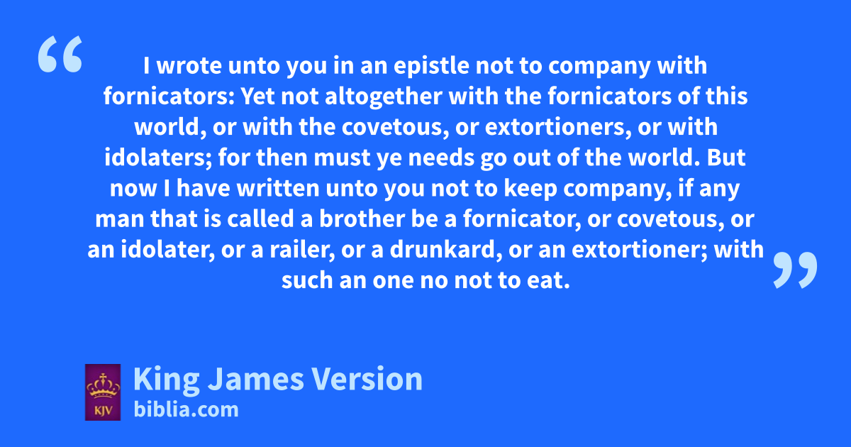 9 I wrote unto you in tan epistle not to company with fornicators: 10 uYet not altogether with the fornicators wof this world, or with xythe covetous, or yzextortioners, or with yidolaters; for then must zzye needs go out of the world. 11 But tnow I have written unto you not to keep company, aif any man that is called a brother be a tfornicator, or ycovetous, or an yidolater, or a brailer, or a cdrunkard, or an yextortioner; with such an one no not to eat. 12 For what have I to do to judge dthem also that are without? do not ye judge ethem that are within? 13 But dthem that are without God judgeth. Therefore fput away from among yourselves that wicked person.