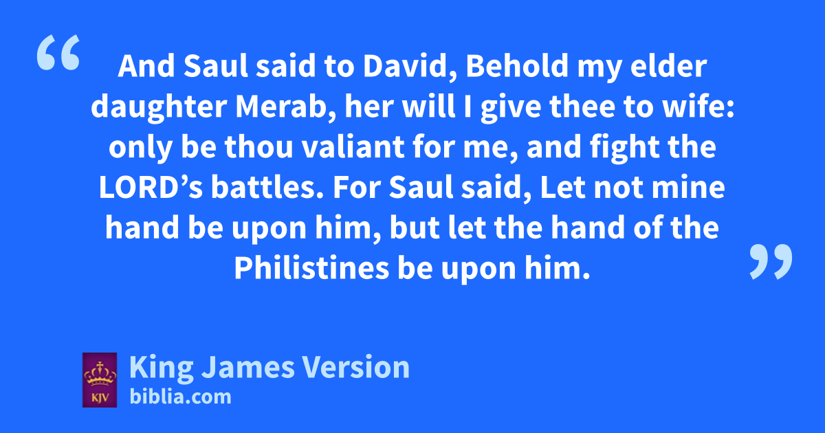 17 And Saul said to David, Behold my elder daughter tMerab, uher will I give thee to wife: only be thou †valiant for me, and fight wthe Lord’s battles. For Saul said, xLet not mine hand be upon him, but let the hand of the Philistines be upon him. 18 And David said unto Saul, yWho am I? and what is my life, or my father’s family in Israel, that I should be son in law to the king? 19 But it came to pass at the time when Merab Saul’s daughter should have been given to David, that she was given unto zAdriel the aMeholathite to wife. 20 And bMichal Saul’s daughter loved David: and they told Saul, and the thing †pleased him. 21 And Saul said, I will give him her, that she may be ca snare to him, and that dthe hand of the Philistines may be against him. Wherefore Saul said to David, Thou shalt ethis day be my son in law in the one of the twain. 22 And Saul commanded his servants, saying, Commune with David secretly, and say, Behold, the king hath delight in thee, and all his servants love thee: now therefore be the king’s son in law. 23 And Saul’s servants spake those words in the ears of David. And David said, fSeemeth it to you a light thing to be a king’s son in law, seeing that I am a poor man, and lightly esteemed? 24 And the servants of Saul told him, saying, †On this manner spake David. 25 And Saul said, Thus shall ye say to David, The king desireth not any gdowry, but an hundred foreskins of the Philistines, hto be avenged of the king’s enemies. But iSaul thought to make David fall by the hand of the Philistines. 26 And when his servants told David these words, it jpleased David well to be the king’s son in law: and kthe days were not †expired. 27 Wherefore David arose and went, he and lhis men, and slew of the Philistines two hundred men; and mDavid brought their foreskins, and they gave them in full tale to the king, that he might be the king’s son in law. And Saul gave him Michal his daughter to wife. 28 And Saul saw and knew that nthe Lord was with David, and that Michal Saul’s daughter loved him. 29 And Saul was yet the more mafraid of David; and Saul became David’s enemy ocontinually. 30 Then the princes of the Philistines pwent forth: and it came to pass, after they went forth, that David qbehaved himself more wisely than all the servants of Saul; so that his name was much †set by.