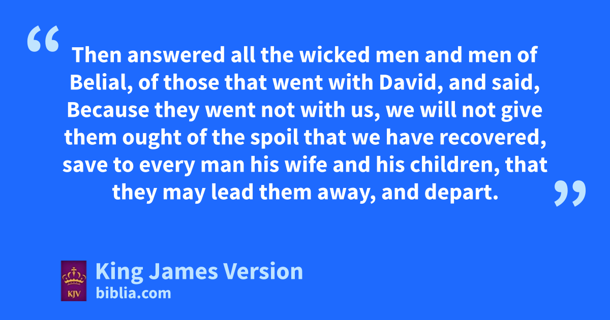 21 And David came to the rtwo hundred men, which were so faint that they could not follow David, whom they had made also to abide at the jbrook Besor: and they went forth to meet David, and to meet the people that were with him: and when David came near to the people, he ||saluted them. 22 Then answered all the wicked men and smen of Belial, of †those that went with David, and said, Because they went not with us, we will not give them ought of the spoil that we have recovered, save to every man his wife and his children, that they may lead them away, and depart. 23 Then said David, Ye shall not do so, my brethren, with that which the Lord hath given us, who hath preserved us, and delivered the company that came against us into our hand. 24 For who will hearken unto you in this matter? but tas his part is that goeth down to the battle, so shall his part be uthat tarrieth by the stuff: they shall part alike. 25 And it was so from that day †forward, that he made it a statute and an ordinance for Israel unto this day.
