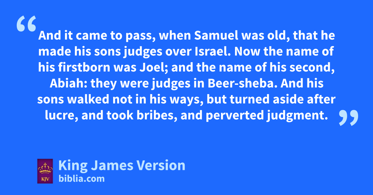 8 *And it came to pass, when Samuel was old, that he amade his bsons judges over Israel. 2 Now the name of his firstborn was ||Joel; and the name of his second, Abiah: they were judges in cBeer-sheba. 3 And his sons walked not in his ways, but turned aside dafter lucre, and etook bribes, and perverted judgment. 4 *Then all the elders of Israel gathered themselves together, and came to Samuel unto fRamah, 5 And said unto him, Behold, thou art old, and thy sons walk not in thy ways: now gmake us a king to judge us like all the nations. 6 But the thing †displeased Samuel, when they said, Give us a king to judge us. And Samuel prayed unto the Lord. 7 And the Lord said unto Samuel, Hearken unto the voice of the people in all that they say unto thee: for hthey have not rejected thee, but ithey have rejected me, that I should not reign over them. 8 According to all the works which they have done since the day that I brought them up out of Egypt even unto this day, wherewith they have forsaken me, and served other gods, so do they also unto thee. 9 Now therefore ||hearken unto their voice: ||howbeit yet protest solemnly unto them, and jshew them the manner of the king that shall reign over them.