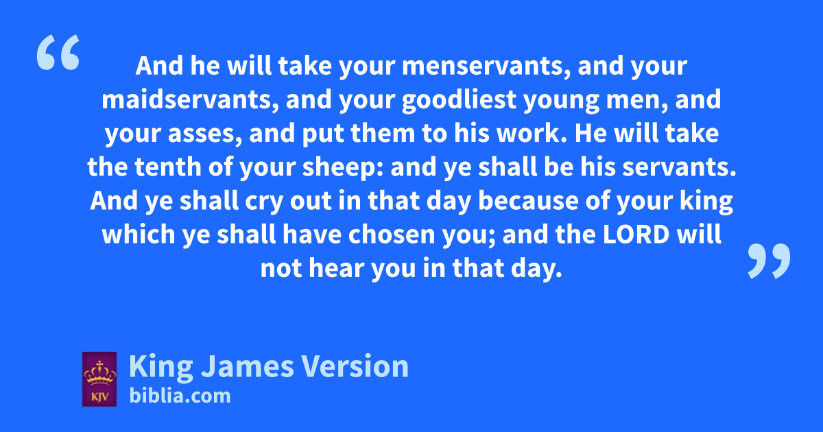 10 And Samuel told all the words of the Lord unto the people that asked of him a king. 11 And he said, kThis will be the manner of the king that shall reign over you: lHe will take your sons, and appoint them for himself, for his chariots, and to be his horsemen; and some shall run before his chariots. 12 And he will appoint him captains over thousands, and captains over fifties; and will set them to mear his ground, and to reap his harvest, and to make his instruments of war, and instruments of his chariots. 13 And he will take your daughters to be nconfectionaries, and to be cooks, and to be bakers. 14 And ohe will take your fields, and your vineyards, and your oliveyards, even the best of them, and give them to his servants. 15 And he will take the tenth of your seed, and of your vineyards, and give to his †officers, and to his servants. 16 And he will take your menservants, and your maidservants, and your goodliest young men, and your asses, and put them to his work. 17 He will take the tenth of your sheep: and ye shall be his servants. 18 And ye shall cry out in that day because of your king which ye shall have chosen you; and the Lord pwill not hear you in that day.
