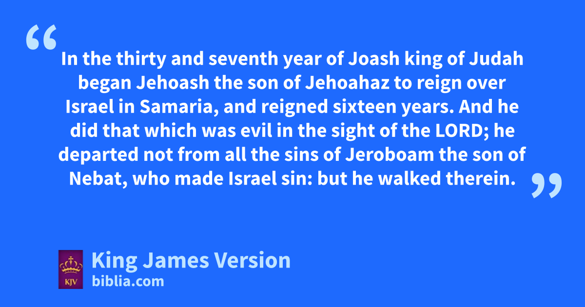 10 In the thirty and seventh year of Joash king of Judah began ||Jehoash the son of Jehoahaz to reign over Israel in Samaria, and reigned sixteen years. 11 And he did that which was evil in the sight of the Lord; he departed not from all the sins of Jeroboam the son of Nebat, awho made Israel sin: but he walked therein. 12 nAnd the rest of the acts of Joash, and oall that he did, and his might pwherewith he fought against Amaziah king of Judah, are they not written in the book of the chronicles of the kings of Israel? 13 *And Joash slept with his fathers; and Jeroboam sat upon his throne: and Joash was buried in Samaria with the kings of Israel.